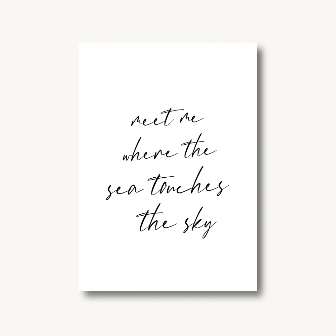 Bring a breath of calm into your space with this minimalist “meet me where the sea touches the sky” art print. The delicate handwritten script and clean white background create a peaceful, airy feel that blends effortlessly with coastal, Scandinavian or modern décor. Perfect for bedrooms, hallways, reading corners, or anywhere you want a little reminder to slow down and dream bigger. A beautiful, heartfelt gift for someone who loves the ocean, travel, or meaningful wall art with a gentle touch.