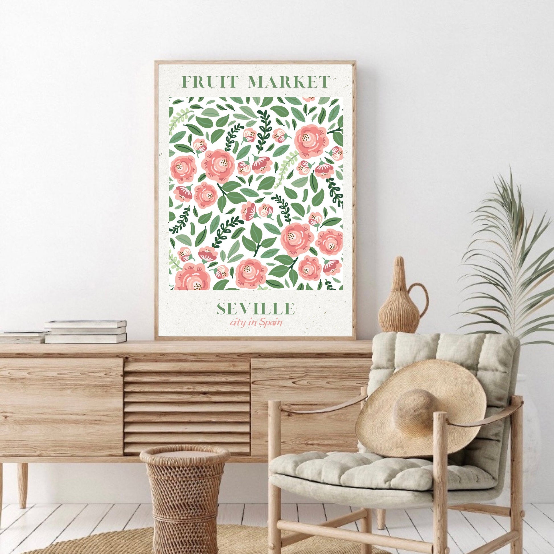 Inspired by the charm of southern Spain, this Seville Art Print captures the warmth and vibrancy of the Mercado de Triana. Lush greenery and soft pink florals come together in a design that feels sunlit, lively, and unmistakably Mediterranean.