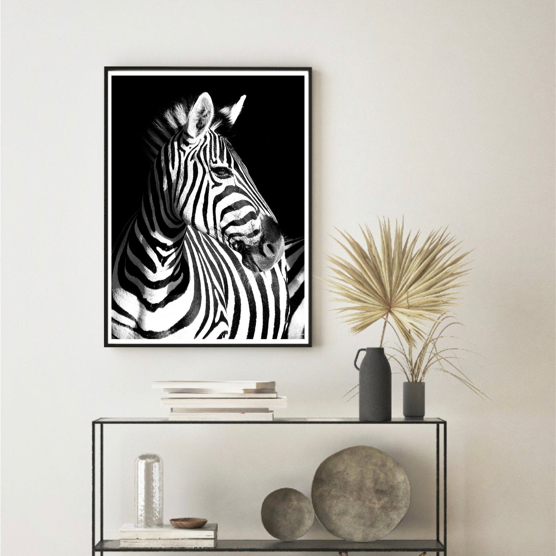 A striking black-and-white zebra portrait that brings pure elegance into any space. The crisp contrast, soft lighting and bold patterning give this print a timeless, gallery-style feel that instantly elevates your walls.